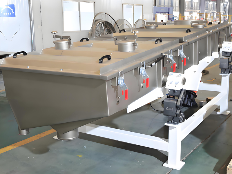 大型直线振动筛采用优质振动电机做为振动源,本筛机配有两台振动电机,工作时两台电机偏心块做相反方向转动,水平方向两台电机合力为零,垂直于电机轴方向形成一合力,电机轴与筛板成一定夹角,合力使物料在筛网上被抛起,同时向前做运动。物料从经给料机均匀地进入筛机的进料口,通过多层不同孔径筛网产生数种产品和不合格的筛上物、筛下物分别从各自的出口排出。