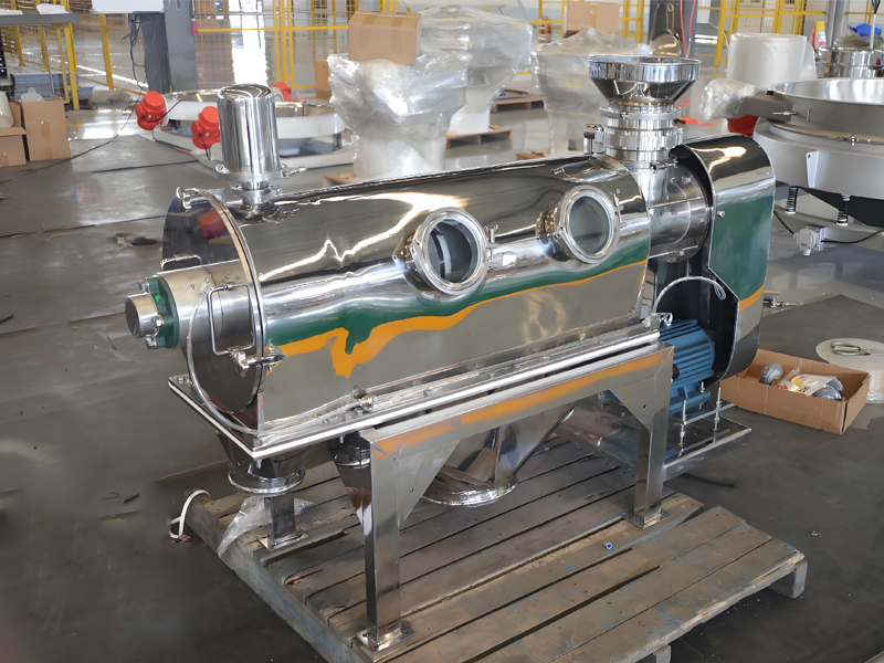 卧式气流筛筛网为圆筒状,置于机体内,筛分物料通过螺旋输送系统后,和气流混合、雾化进入网筒内;通过网筒内风轮叶片使物料同时受离心力和旋风推进力,原料混合体从气流入口进入机体,通过智能化涡轮加力。使物料分散单体向复合筛网有序通过,顺风路方向进入下道工序,不能过网的物料沿网筒壁从粗料排出口排出,从而达到物料分离的目的。