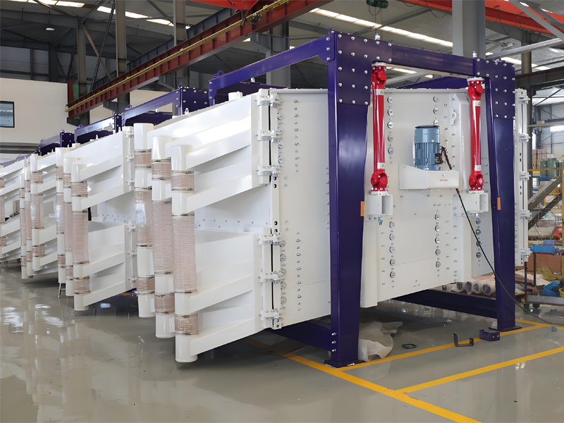 长方形摇摆筛启动后,筛机摇动体即筛箱在惯性力的作用下作前后往复运动,筛箱带动筛面作周期性摇动,从而迫使筛箱上的物料随着筛箱一同作定向跳跃式运动,在这期间,小于筛面孔径的物料通过筛孔落到下层,成为筛下物,大于筛面孔径的物料连续翻滚跳跃运动后从出料口排出,从而完成筛分工作。